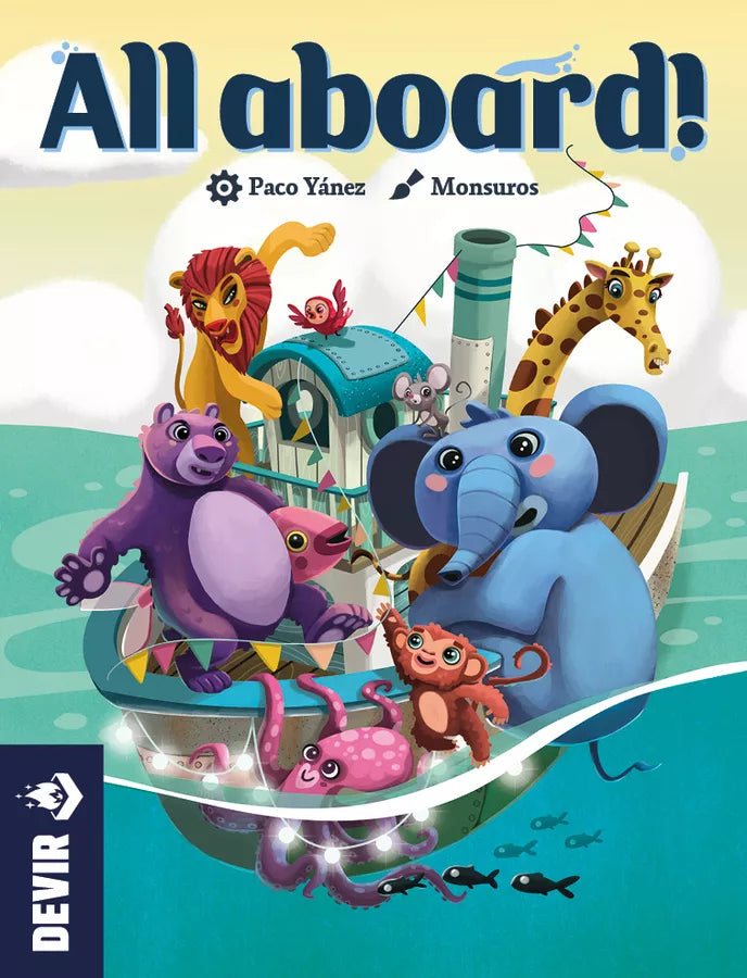 In All Aboard! you must get your gang of animals to safety in the different boats, but be careful not to exceed their capacity, or else they will sink. Designed by Paco Yánez and illustrated by Monsuros, this fun card game can be played as a couple or in groups of up to 5 players, from 7 years old, in games lasting about 20 minutes.