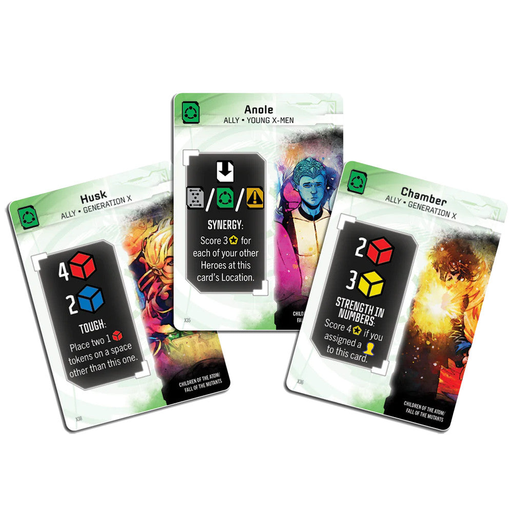 The cards and game boards have a gorgeous dreamscape art effects as if a powerful telepath is seeing them through Cerebro, and players' heroes are represented by a set of striking full-color acrylic standees. Teams include fan-favorites like Wolverine & Jubilee, Jean Grey & Cyclops, Forge & Storm, and more!