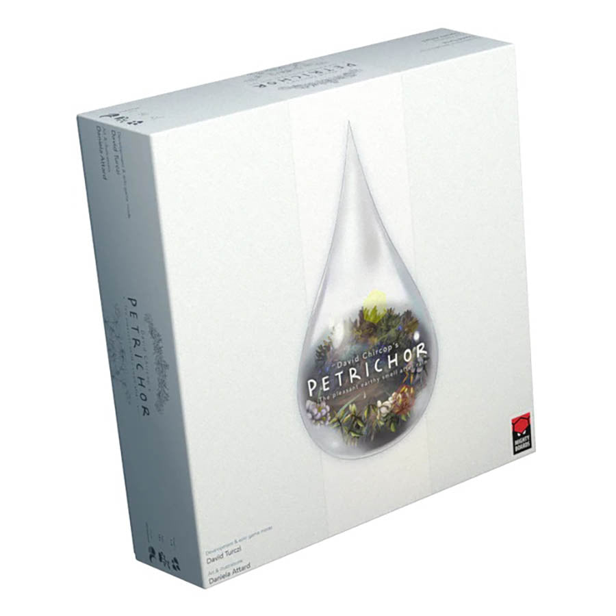 Petrichor is a highly interactive board game, playable by 1-4 people (up to 5 with the expansion, see below). It’s an action selection/area influence game, with 4 simple actions which interact with the various fields in ever surprising ways. The players move clouds with water droplets, and then rain those droplets onto specific fields, to make sure they have the right amount of water for the Harvest. During a Harvest, crops that have been watered enough are scored! Players are able to influence when, and how often the harvest happens. Players need to strike a fine balance between maintaining control of the different fields as well as influencing Harvest, to make sure the two come together at the optimal time.