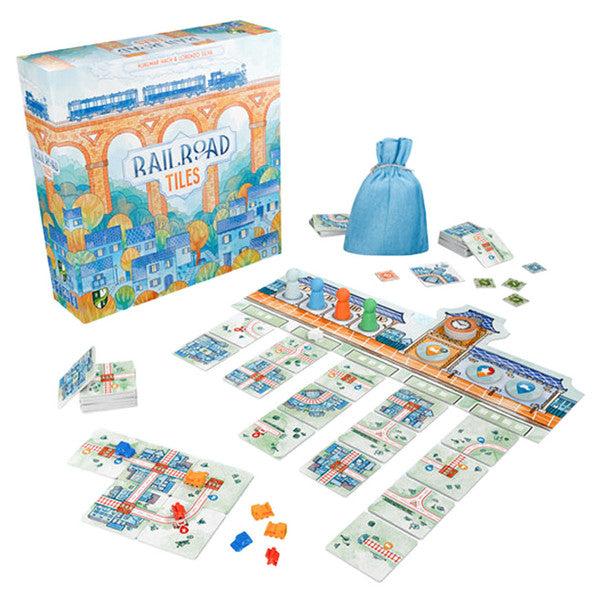 Railroad Tiles, a sequel to the roll-and-write series Railroad Ink, is a quick-playing tile placement game in which you pick tiles and place routes to build an interconnected community.