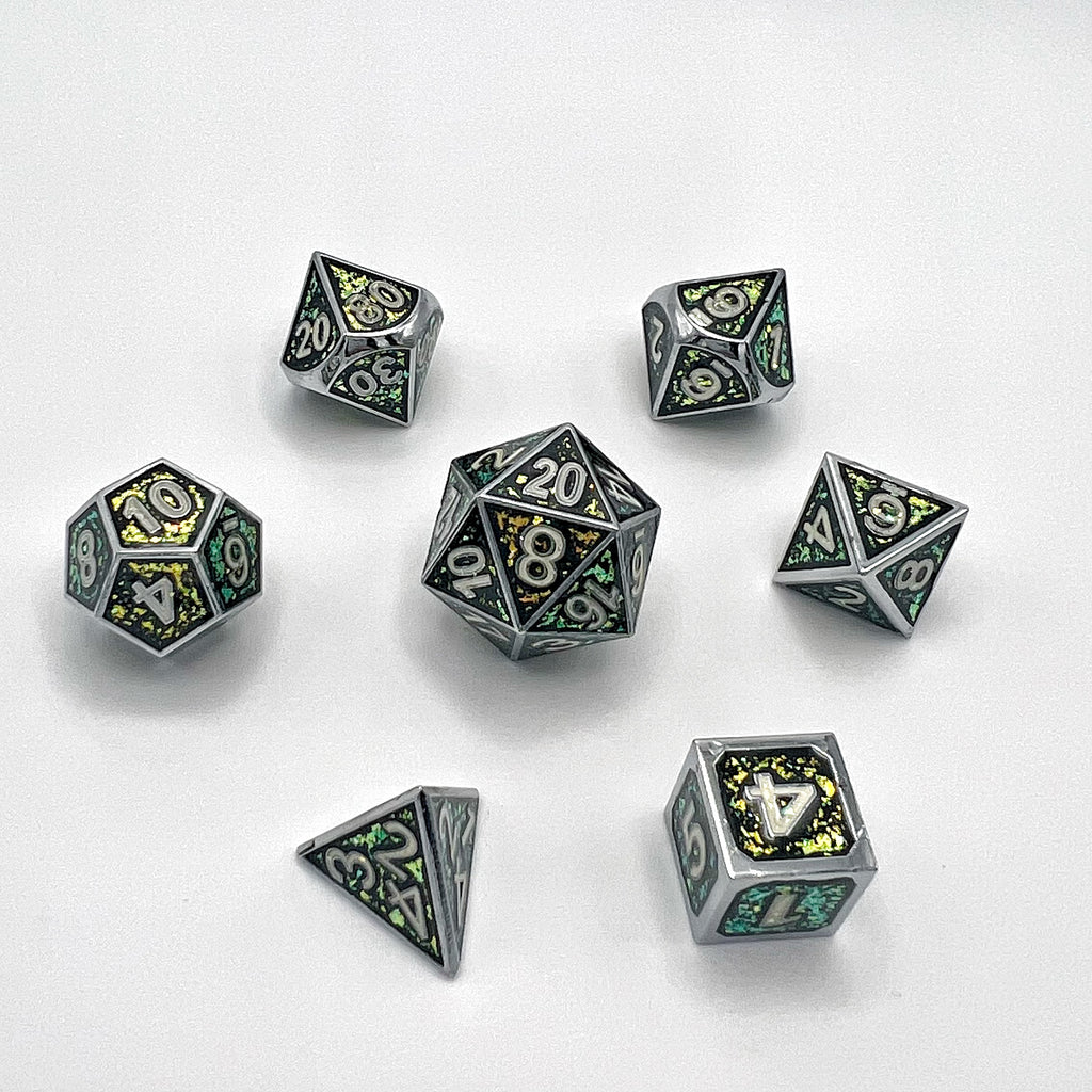 Raised Number Metal Dice Set 2 - Silver, Green Magic Glitter w/ White