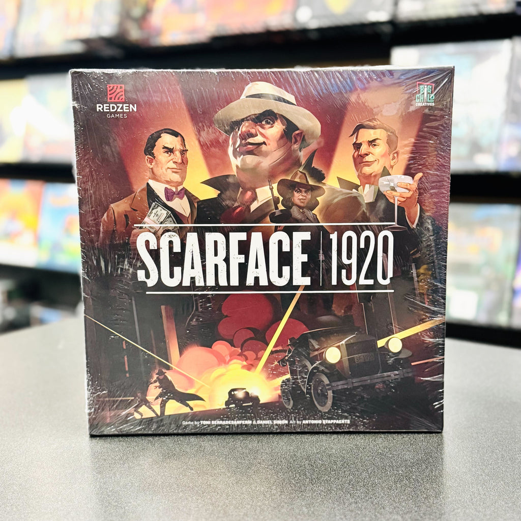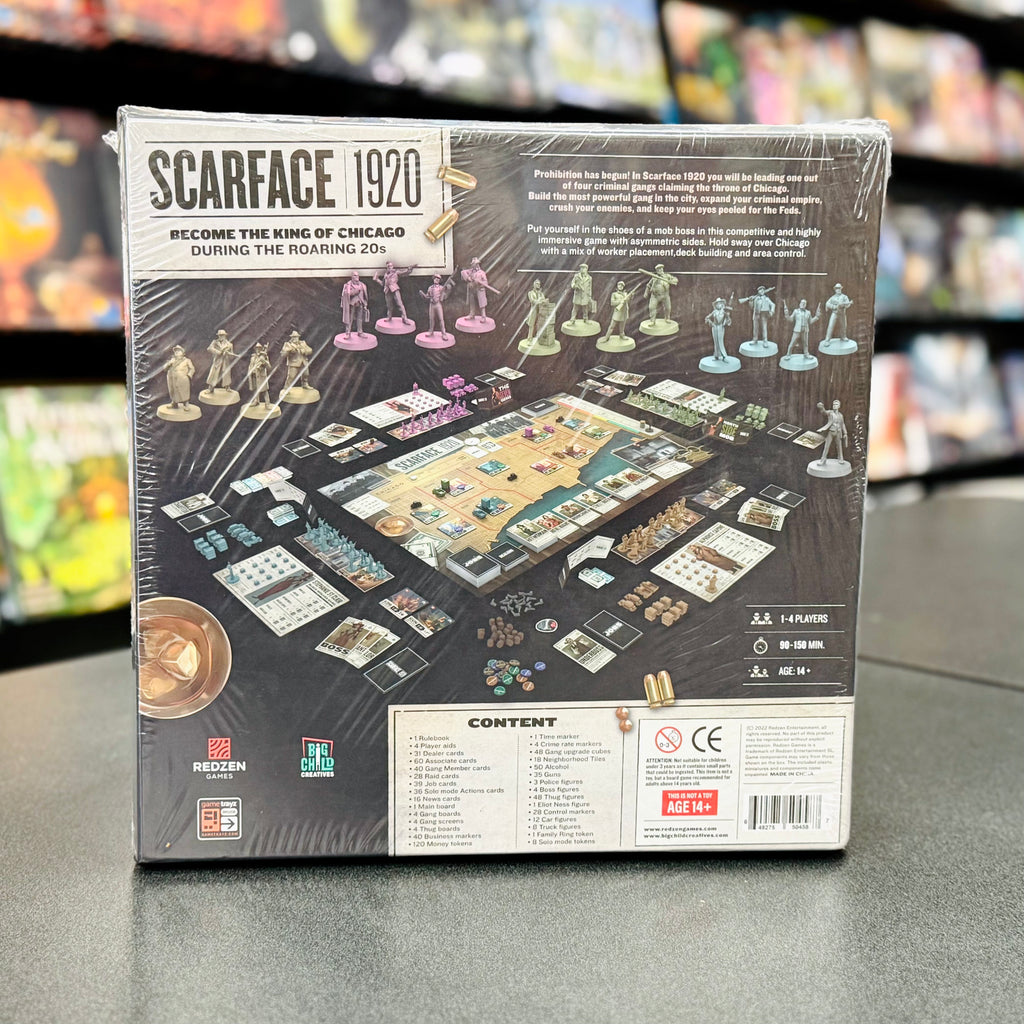 Included: Scarface 1920 Core Game, Card Sleeves, Plastic Business Markers, Wooden crates for goods, Plastic Money Tokens, Enforcers Expansion, GameTrayz Inserts, Stretch Goals, PlayMat.