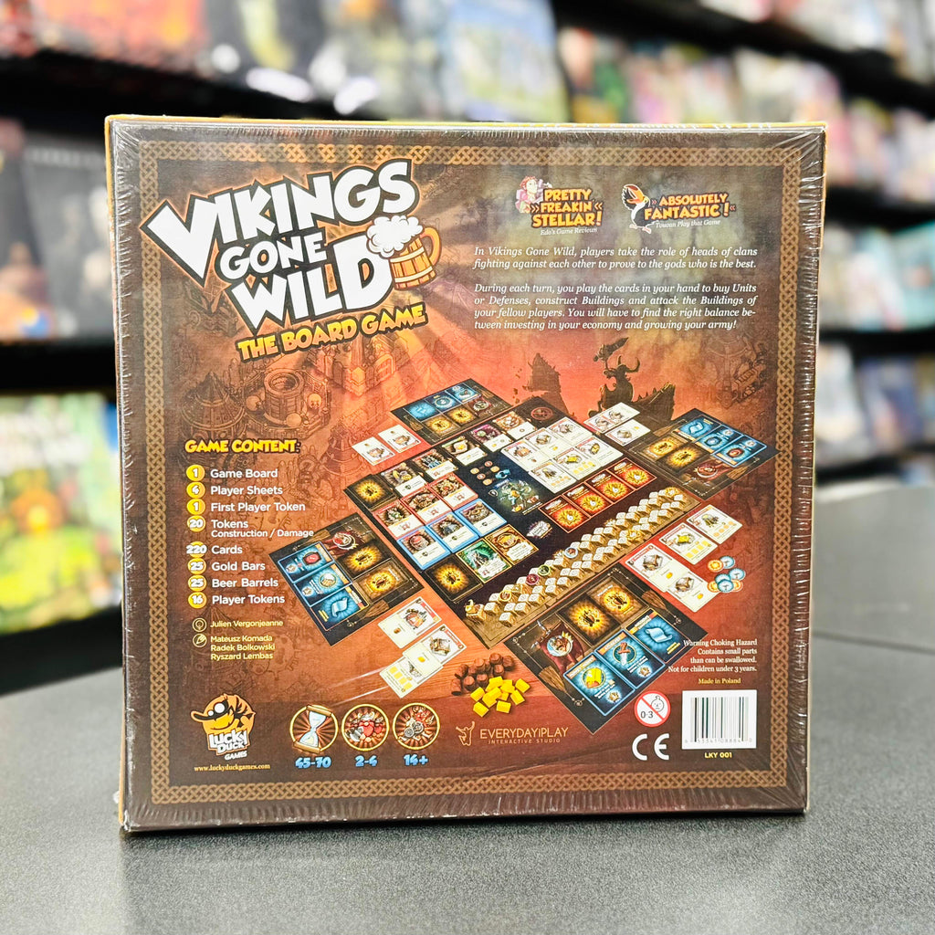 Each turn in Vikings Gone Wild — a deck-building, resource management game based on the online real-time strategy game — players can either buy permanent buildings sitting in front of them (resource factories, resources containers, etc) or buy units, towers and special cards that improve their deck and offense/defense capacity.