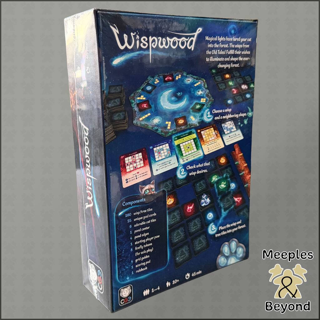 Wispwood is a family-friendly tile-laying and pattern-building game set in a magical forest aglow with mischievous wisps. Players take on the role of forest caretakers, laying down colorful polyomino tiles to attract and satisfy the whims of these glowing spirits—all while a curious cat prowls nearby, drawn to the brightest lights.